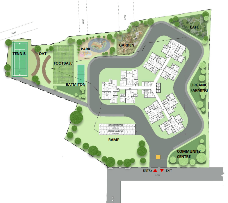 A radial masterplan with a green central core (the “trunk”) and branching wings that carry light, breeze, and community outward—an extroverted plan that connects to its site.